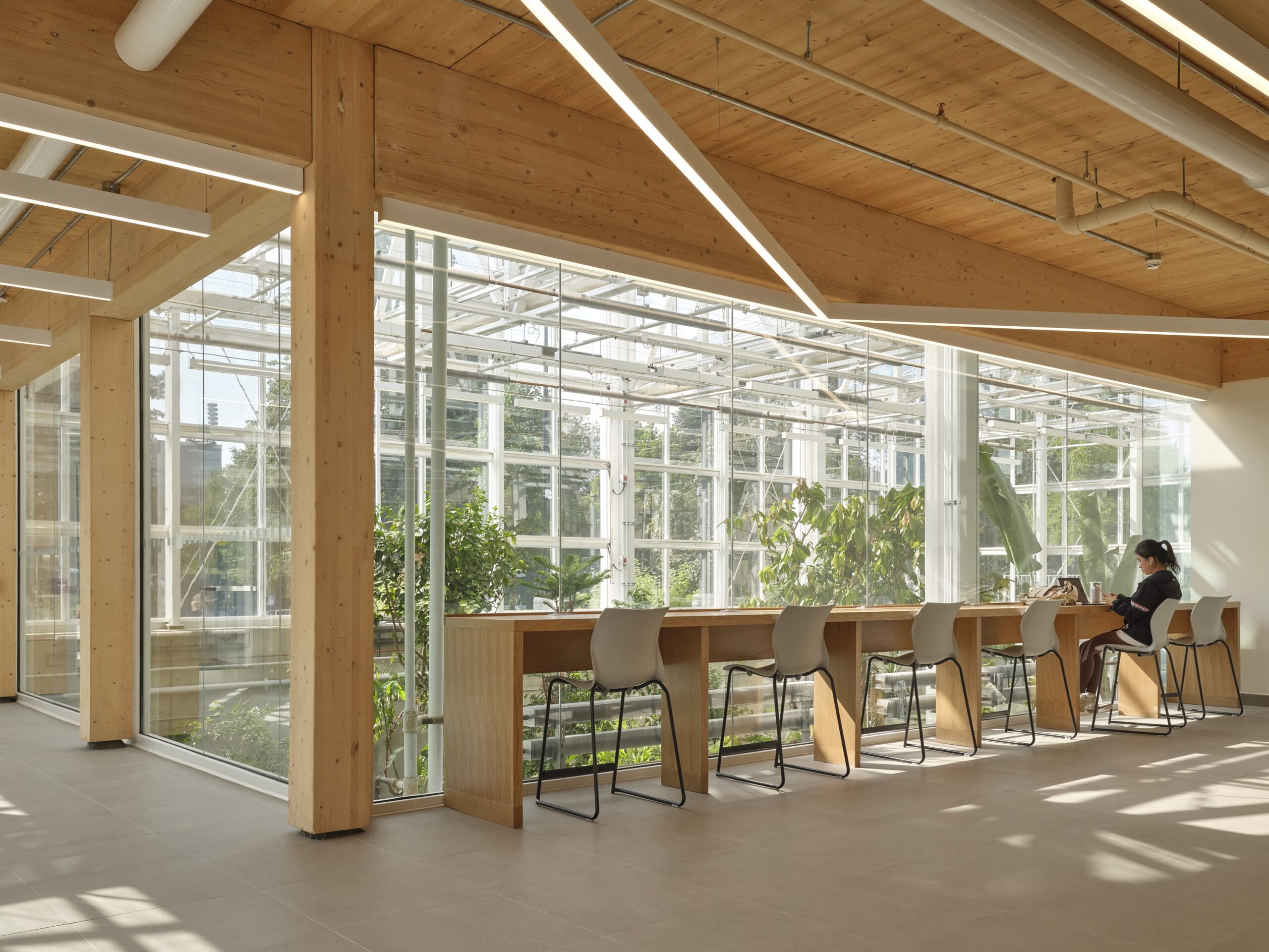 We renovated existing classrooms, study areas, barrier-free bathrooms, and a mass-timber lobby fitted with new lighting, while also adding an 11,400 sq. ft. below-grade greenhouse that will serve the Department of Biology’s faculty, staff, and students.